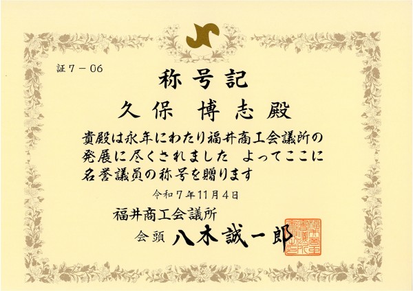 幸伸食品 2025.11.13 久保会長が商工会議所の名誉議員として表彰されました。 採用情報 オンラインストア 取締役会長の久保は、福井商工会議所にて長く議員として、福井県の発展に努めてまいりましたが、 本年11月をもって議員を退任し、名誉議員として表彰をされました。 戻る
